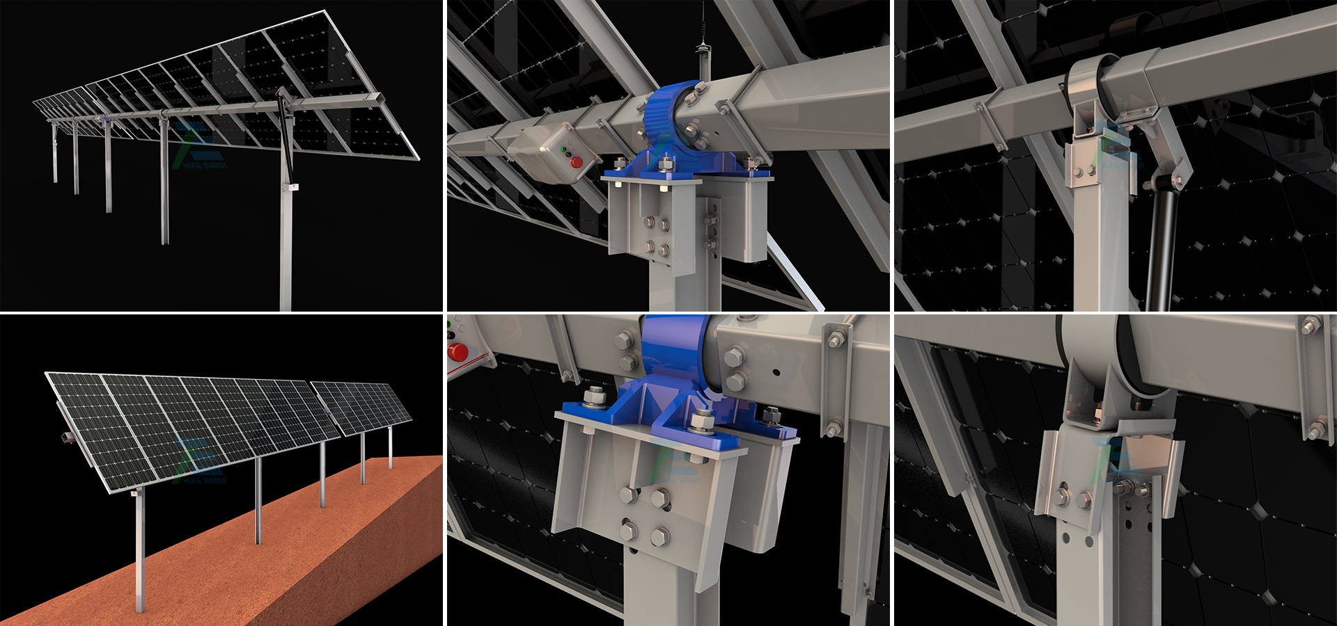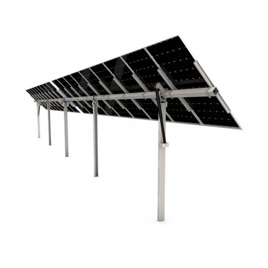 Solar tracking system is oriented north-south and tracks east-west. Powered by motors and guided by astronomical algorithms, it aligns the module with the sun's azimuth. This optimizes direct sunlight exposure on the PV module surface to enhance power generation.