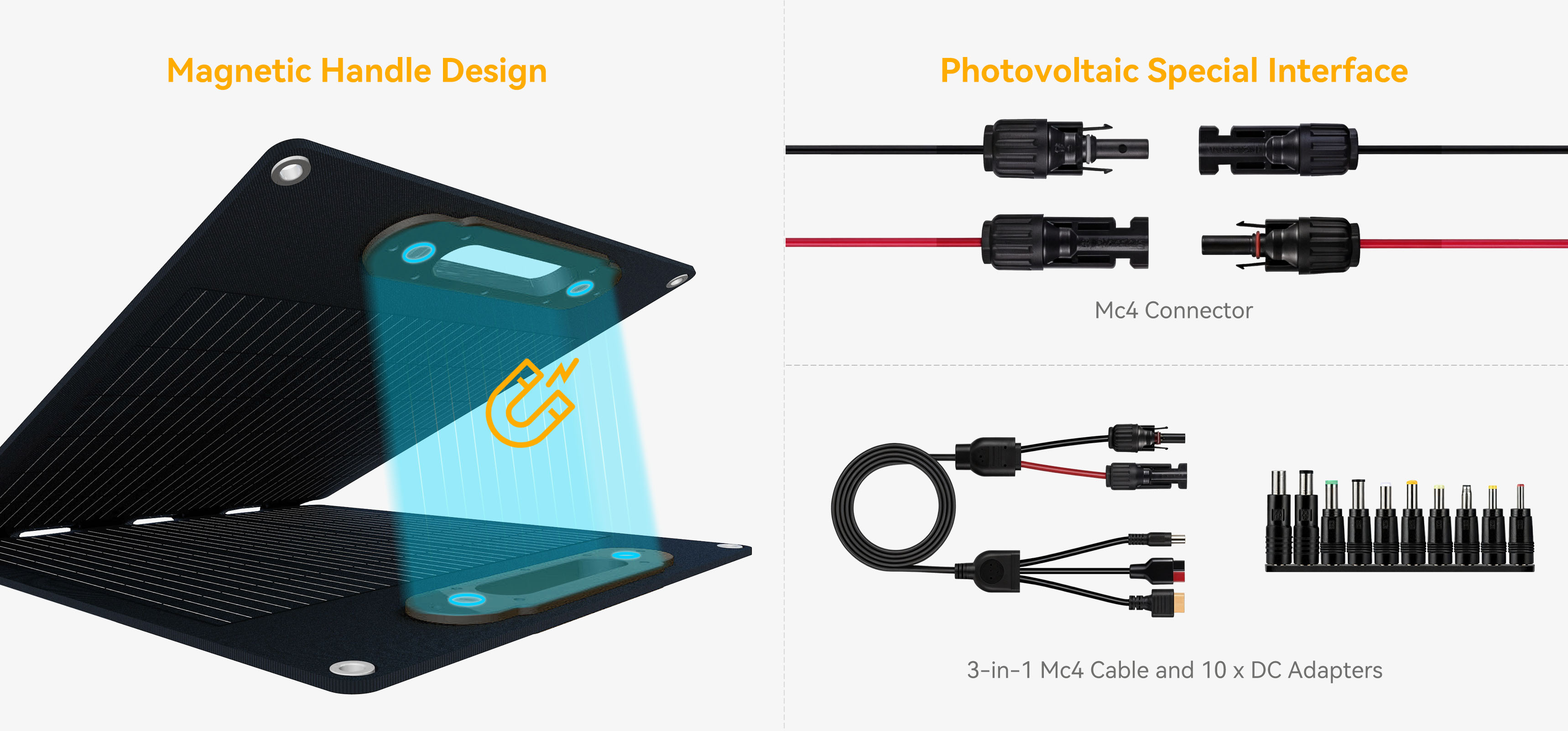 Crafted with high-efficiency monocrystalline silicon cells, the MAG 100W portable solar panel achieves a remarkable energy conversion rate of up to 23%. It efficiently captures solar energy even in low-light conditions, enabling rapid charging for a wide range of devices. Its charging performance significantly surpasses that of conventional solar panels.