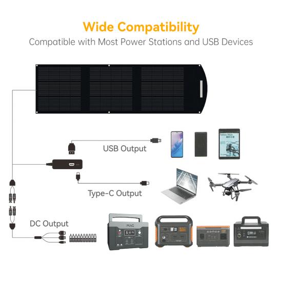 This solar panels comes with a DC5521 output cable and can directly connect to the included 4-in-1 interface cable (DC5521). It is compatible with 98% of solar generators/portable power stations on the market (including brands like Mag solar, Jackery, Ecoflow, Bluetti, Paxcess, Suaoki, Flashfish, etc.).