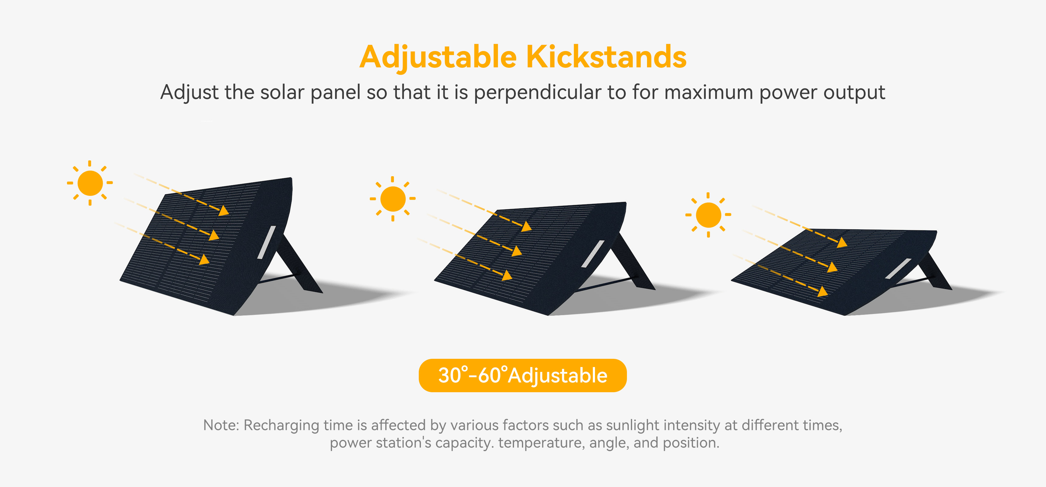 It features a magnetic handle for easy portability and storage, two adjustable kickstands for stable ground placement, and reinforced hanging holes for additional mounting options. It's perfectly suited for RV travel, camping, and emergency power needs.