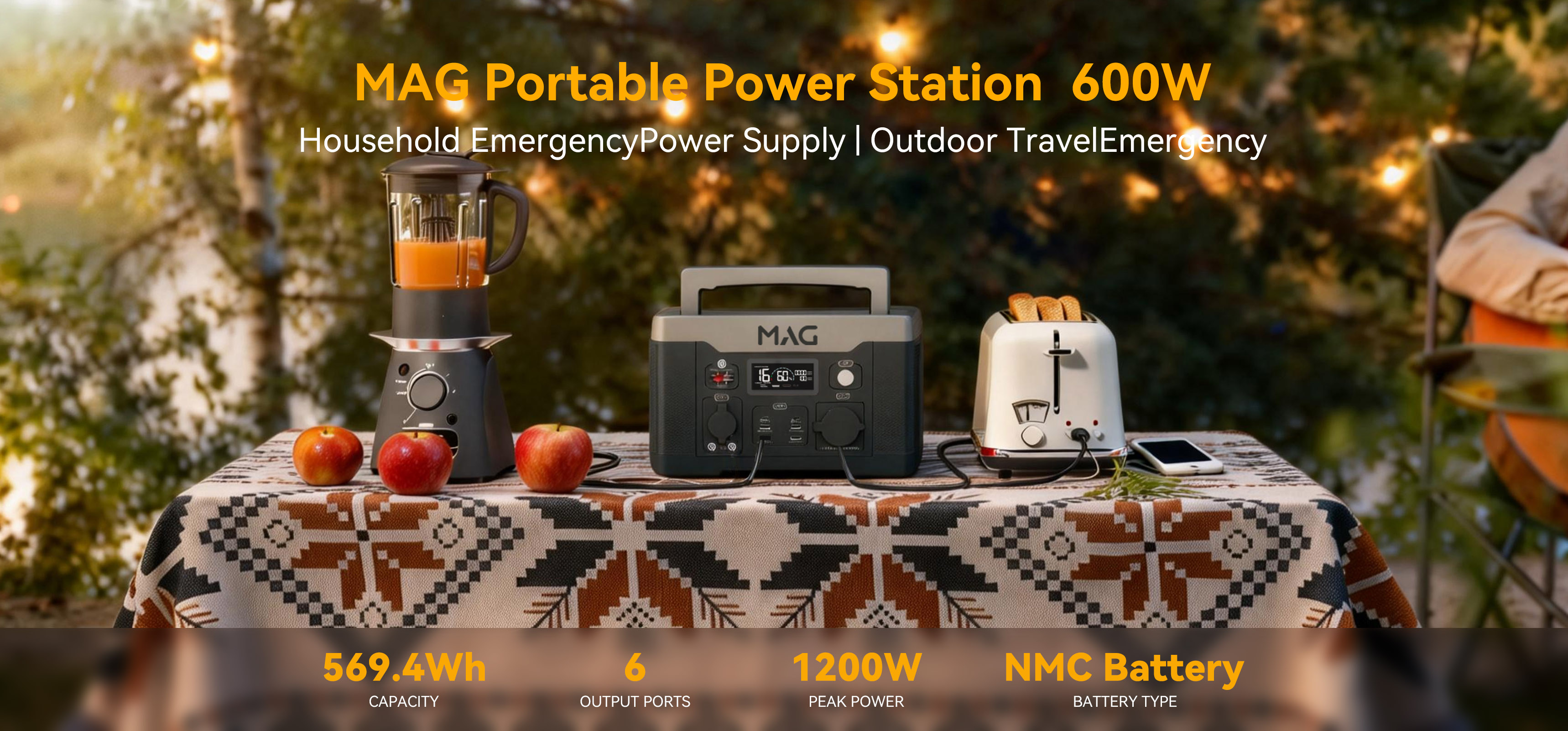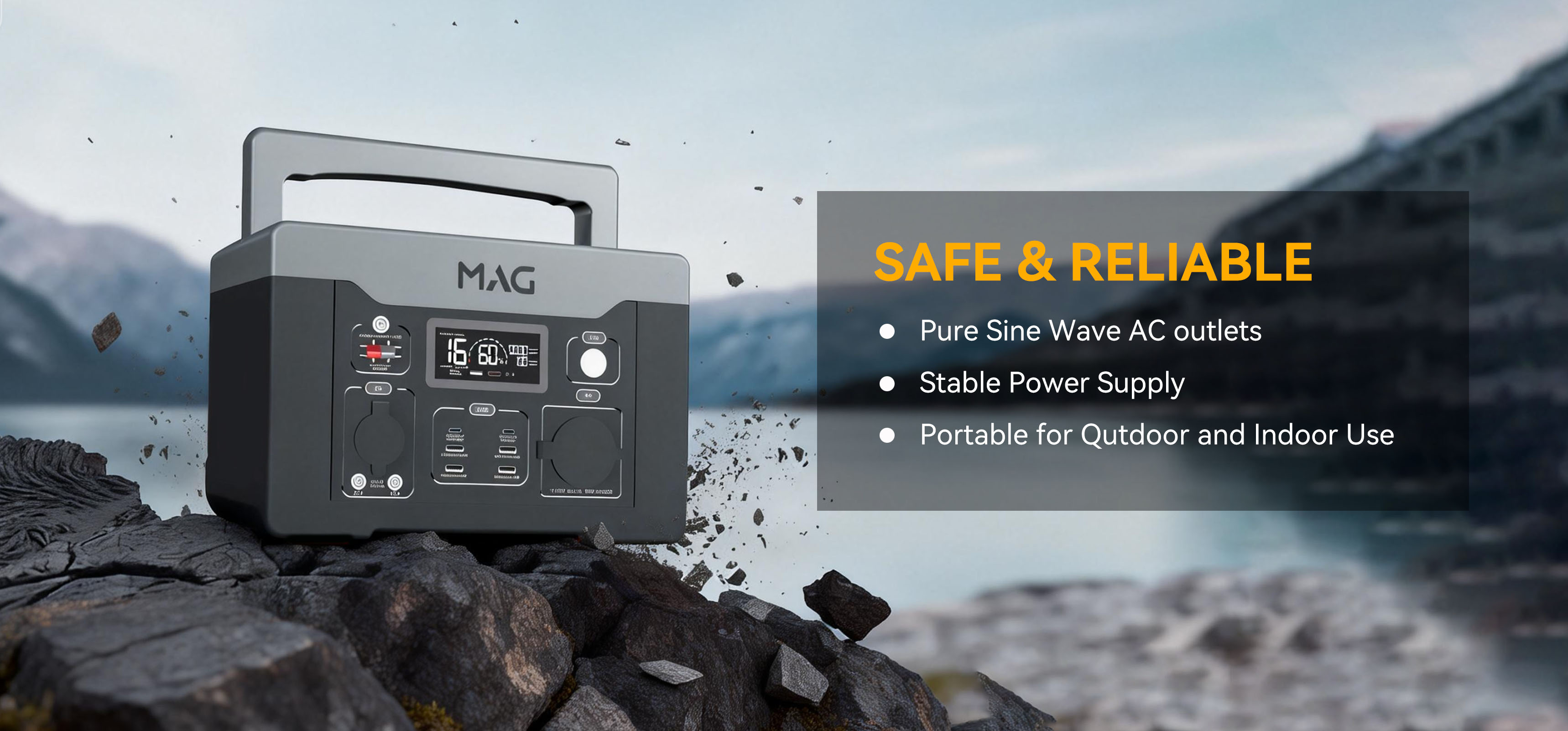 Armed with a 569.4Wh 18650 NMC Battery, the MAG-Y-600A features 2 Pure Sine Wave AC outlets that deliver stable and safe 600W power. The portable power station weighs only 5.66kg. You can simply rest assured in outdoor off-grid activities.